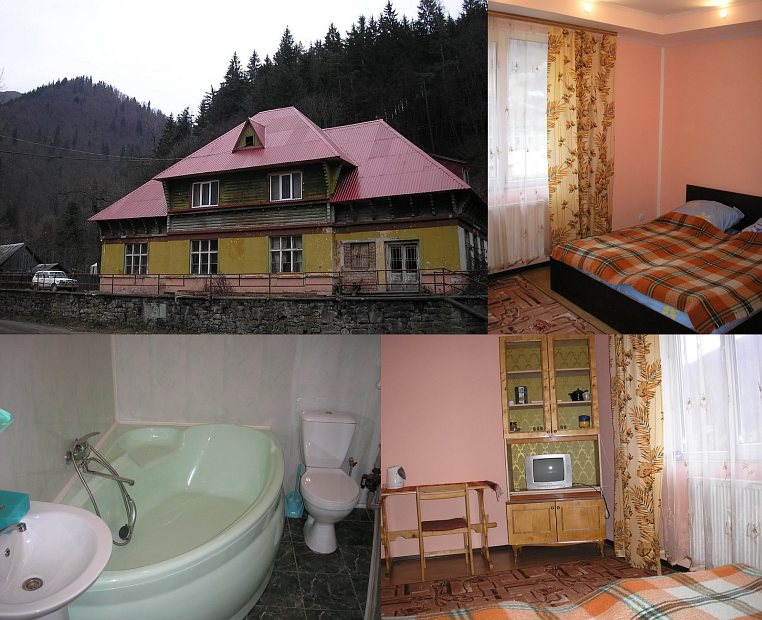 Ціна: Celoročně mimo Silvestr (5.1.-28.12.): pokoj Ekonom (příslušenství na patře) 200 UAH/os/noc, lepší pokoj (2 lůžka, koupelna, TV) 300 UAH/os/noc, luxusnější apartmán (2-pokojový, 2 lůžka, koupelna, TV) 600 UAH/os/noc. Silvestr (30.12.-4.1.): pokoj Ekonom 250 UAH/os/noc, lepší pokoj 350 UAH/os/noc, luxusnější apartmán 650 UAH/os/noc. Snídaně 90 UAH, oběd 150 UAH, večeře 130 UAH. Půjčení lyžařské výbavy 70-100 UAH/den. Sauna 500 UAH/hod.
