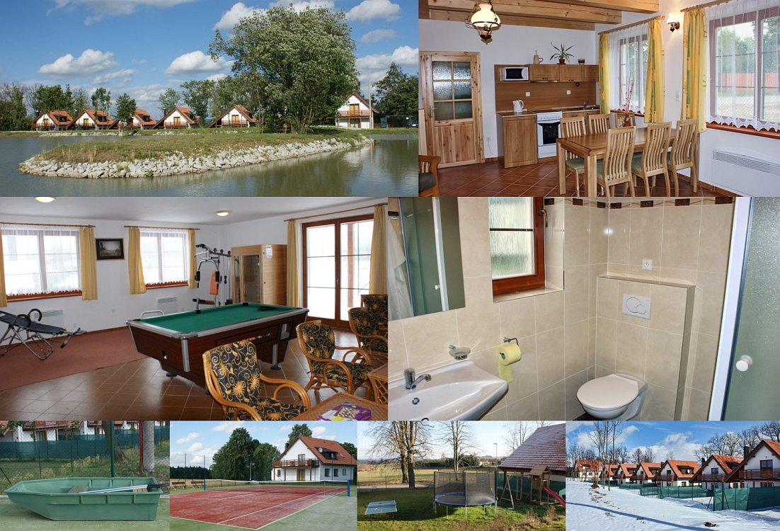Житло: Kemp (chatová osada) se sedmi 6-lůžkovými chatami, v roce 2010 nově vystavěnými. Každá chata má na patře 2 pokoje (4+2 lůžka, 2 stolky, 4 křesla), koupelnu, balkon, v přízemí předsíň, koupelnu, kuchyňský kout (nádobí, sporák, lednice, konvice, mikrovlnka), obývací pokoj (sedací souprava, stolek, TV, krb+topivo), bezplatný internet. Venkovní posezení (gril). Parkování pro 2 auta u každé chaty. Pro hosty zdarma sportovní rybaření v rybníku Žlibečník, půjčení loďky (zdarma), tenisové (multifunkční) hřiště, dětský koutek s hřištěm, trampolínou a stolním tenisem. Za poplatek využití spol. místnosti (kulečník, infrasauna, malé fitness). Kemp je v provozu po celý rok.